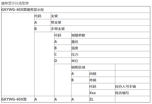 實例:GKYWG-60X Ⅲ罐旁顯示儀(RS485信號),A代表,A代表帶支架,AB代表液位和溫度顯示, A代表內銷ZL代表銷售人員為張亮。