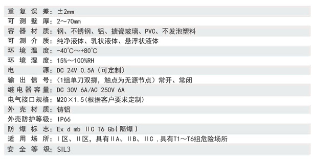 GKYWG-65外貼式超聲波液位開關(以下簡稱液位開關)是我公司研發生產的一種新型非接觸式液位檢測報警儀表。液位開關通過探頭傳感器產生的高頻超聲波脈沖可穿過容器壁,這個脈沖會在容器壁和液體中傳播,還會被反射回來。通過超聲波反射特性的檢測和計算,就可以判斷出容器內監測點是否有液體。同時液位變送器通過繼電器信號從而實現對液位的監測和控制,可適用于制藥、石油、化工、電力、食品、物流運輸等行業的液位過程控制。