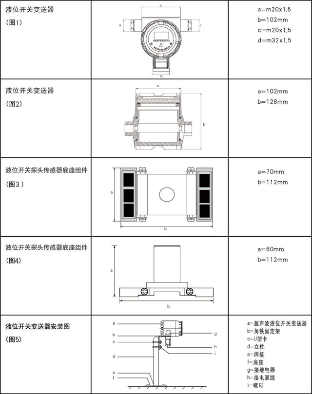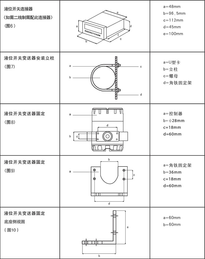 液位開關變送器固定參照圖5、圖7、圖8、圖9、圖10